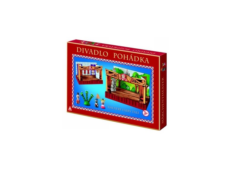 Divadlo Pohádka obsahuje podstavec, 2 kulisy z tvrdého papíru a 4 dřevěné figurky. Baleno v krabici z tvrdého papíru. Nevhodné pro děti do 3 let. Obsahuje malé části. Výrobek je zdravotně nezávadný.