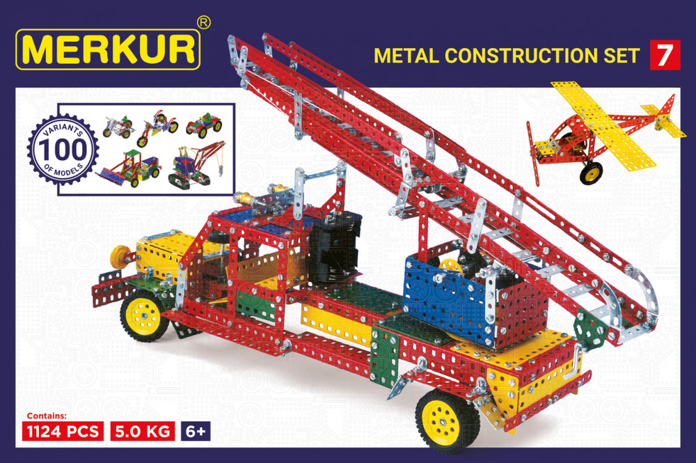 Merkur 7 stavebnice je velká čtyřvrstvá klasická stavebnice. Obsahuje základní sestavu součástek a k tomu navíc další součástky pro stavbu velkého požárního auta, velkých jeřábů a dalších modelů. Součástí stavebnice je velká návodová knížka s návodem na stavbu 100 modelů - hasičského automobilu, autojeřábu atd.